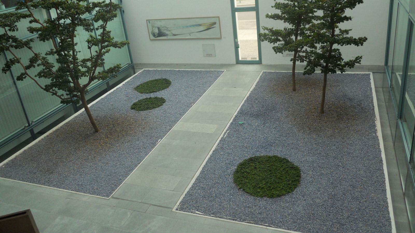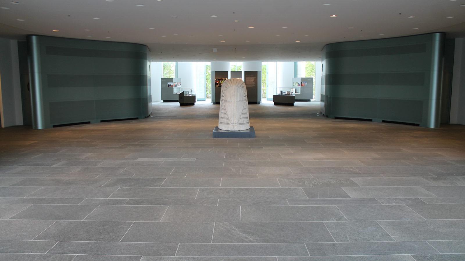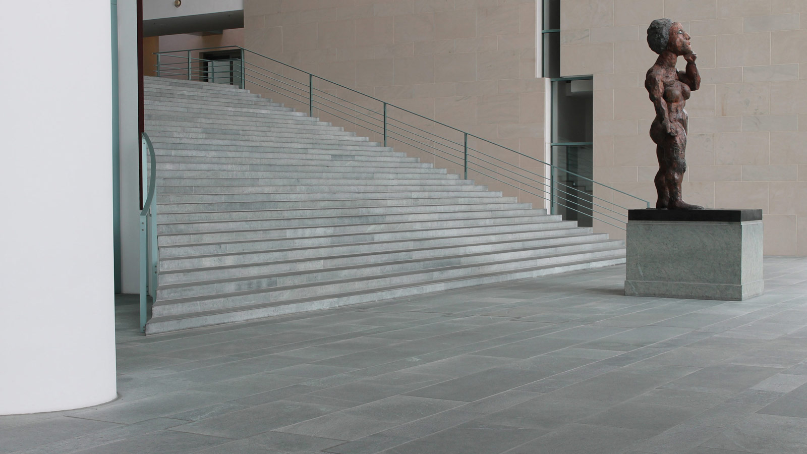 Pavimenti interni ed esterni, scale e fioriere. Architetto: Axel Schultes, Charlotte Frank, Christoph Witt. Materiale: Serpentino Verde Vittoria sabbiato. Consegna: completato nel 2004.