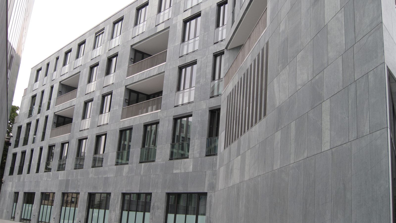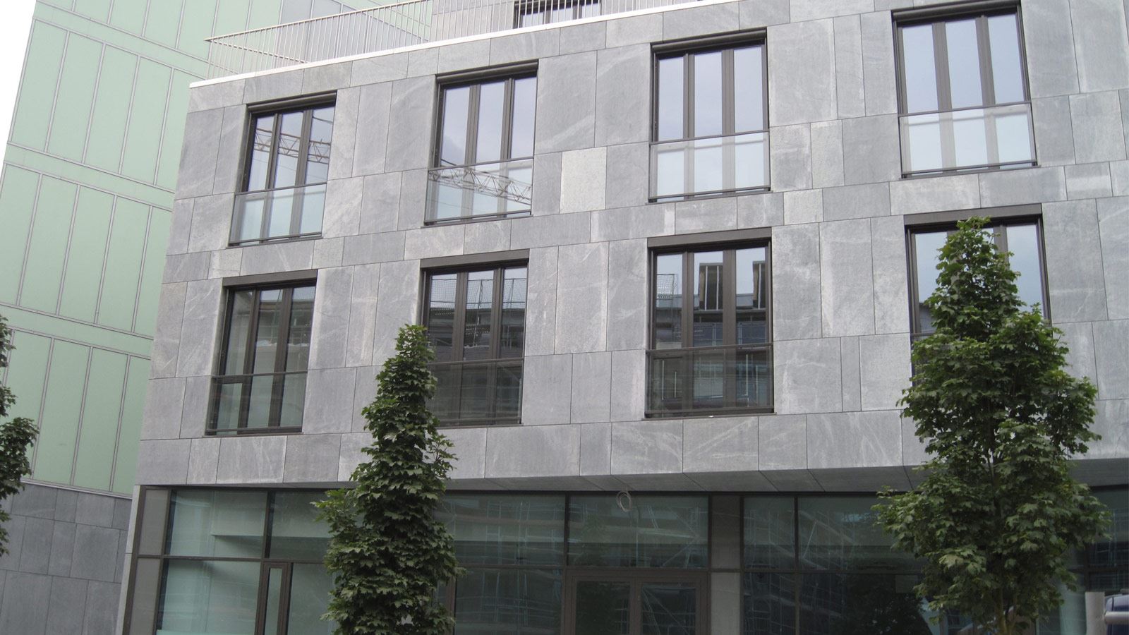 Rivestimento facciata esterna. Architetto: Schneider Meyer Partner. Materiale: Serpentino Verde Vittoria sabbiato. Consegna: completato nel 2008.