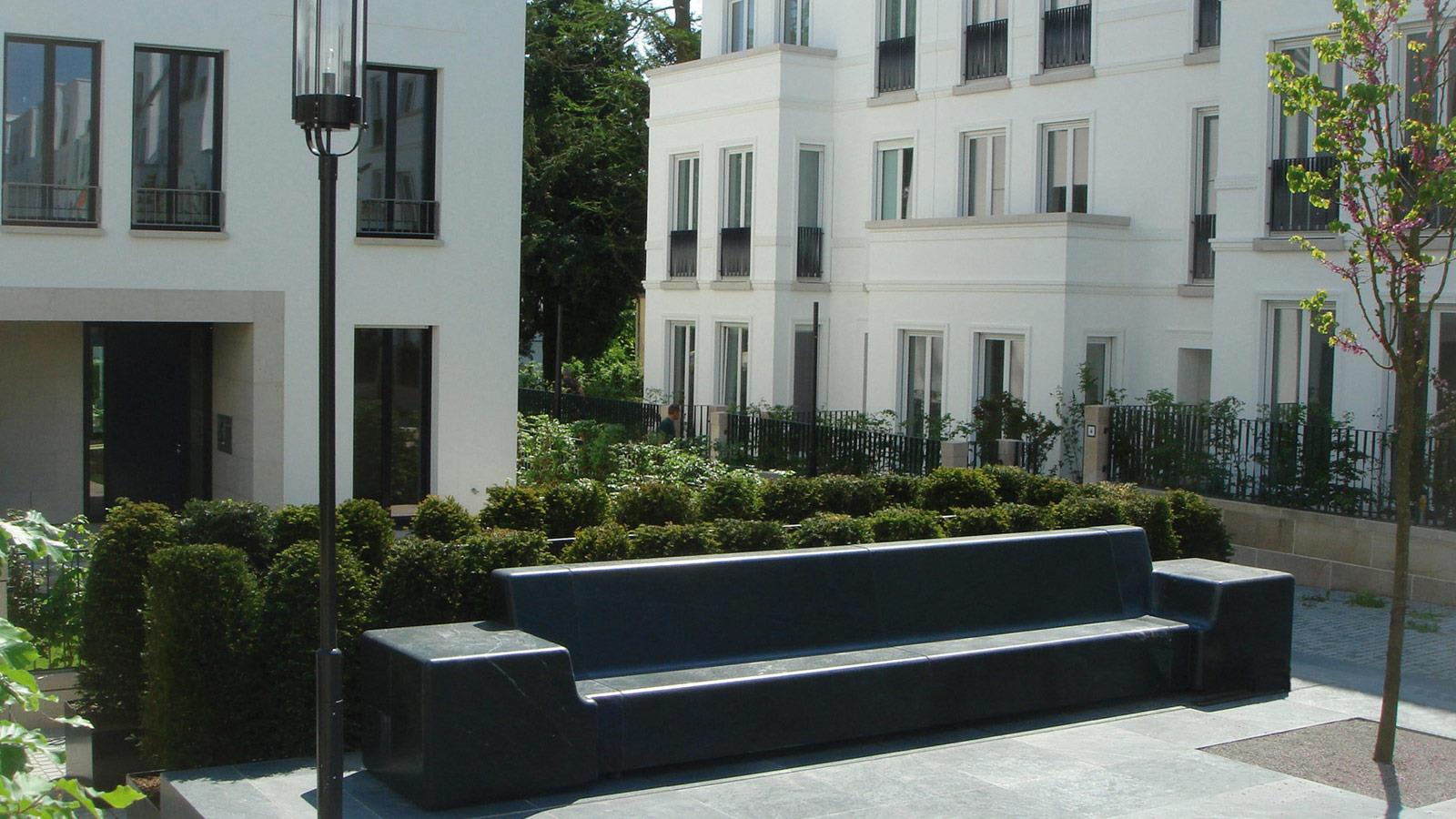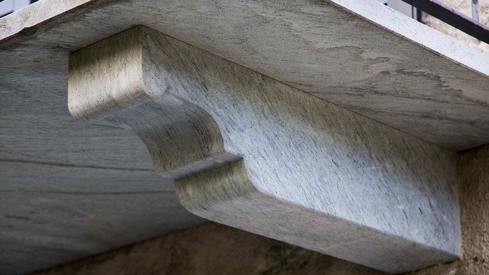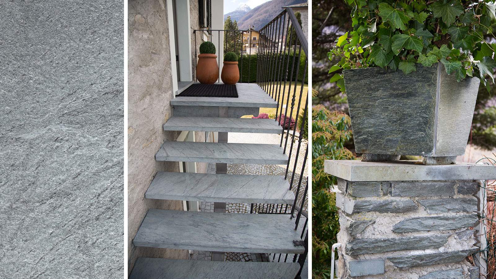 Diversi sono gli elementi in serpentino studiati per valorizzare gli ambienti esterni: in particolare, rocce, fontane, tavoli, panche, balconi, fioriere, davanzali, colonne.